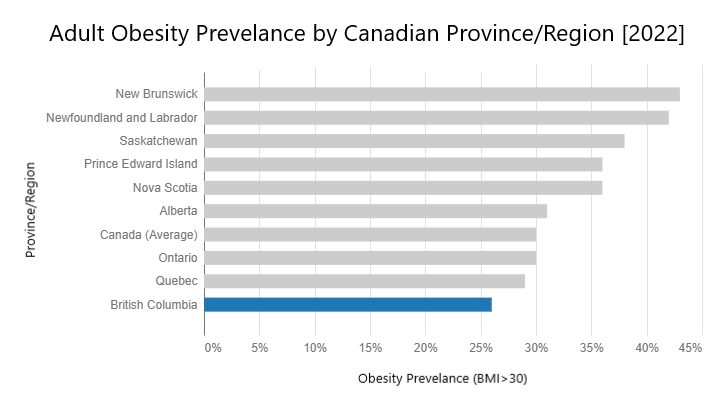 Obesity is a significant health concern across Canada. According to a report by the Ottawa Hospital Weight Management Clinic, 15–19% of adults in British Columbia are obese, with a Body Mass Index (BMI) of 30 or greater.